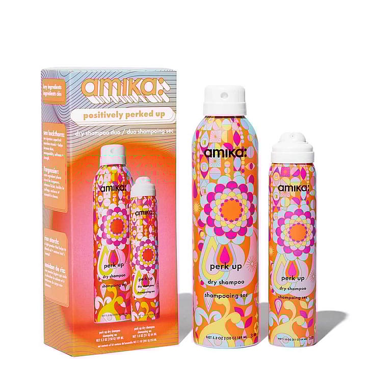Piristä säikeitä kuivashampookaksikolla, joka sisältää täysikokoisen ja matkakokoisen Perk Up Dry Shampoon, joka virkistää juuria ja lisää välitöntä vartaloa kotona ja tien päällä.