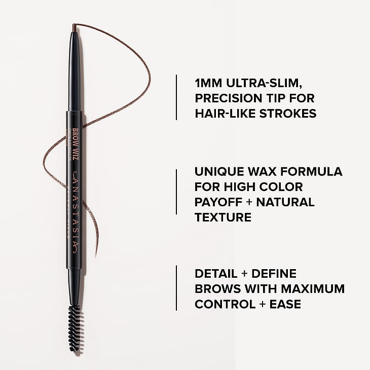 Anastasian Brow Wiz täyttää täydellisesti harvatkin kulmakarvat! Kynä on kierrettävä, joten sitä ei tarvitse teroittaa. Tahmaamaton koostumus luo luonnollisen lopputuloksen. Helppo levittää ja kestää koko päivän. Toisessa päässä on kulmaharja, jolla kulmat on helppo siistiä ja muotoilla. Kulmaharjalla ja kynällä saat aikaan luonnollisen kauniit ja muotoillut kulmat.
