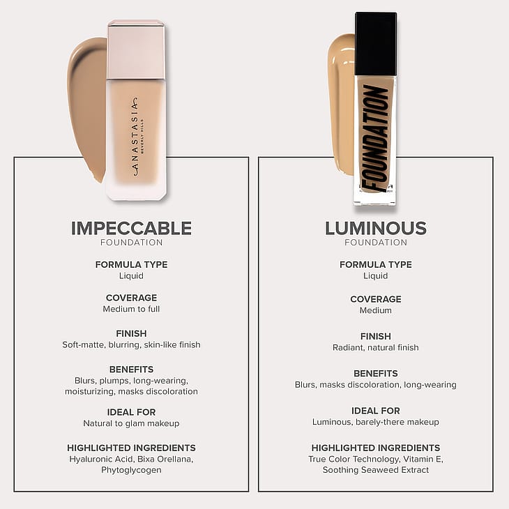 Anastasia Beverly Hillsin Luminous Foundation on vedenkestävä, juokseva meikkivoide, joka antaa hehkuvan ja luonnollisen lopputuloksen. Ainutlaatuinen puolipeittävä koostumus tuntuu kevyeltä iholla ja näyttää raikkaalta. Vihdoinkin saat peittävyyttä ja hehkua samalla tuotteella!