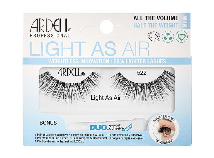 Ardell Light As Air -sarjassa on hyödynnetty uusinta teknologiaa, jonka avulla irtoripsillä voi luoda kauniin siluetin ja pehmeän rakenteen. Ripset ovat erittäin runsaat mutta painavat puolet vähemmän kuin tavalliset irtoripset. Mukautuva kiinnitysnauha tuntuu niin miellyttävältä, ettet edes huomaa ripsiä. Erityisen kevyttä synteettistä karvaa. Mukana minikokoinen DUO-liima (1 g). Täysin vegaaninen.