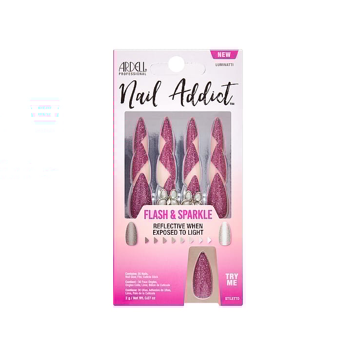 Salonkilaatuiset kimaltelevat kynnet hetkessä. Ardells Nail Addict Flash & Sparkle -tekokynsillä on kimalteleva hohto. Innovatiivisella, heijastavalla kiiltotekniikalla valmistetut kynnet loistavat ja kimaltelevat eri valoissa. Teho aktivoidaan salamavalolla, LED-/UV- ja diskolampuilla. Anna kynsiesi loistaa! Pakkaus sisältää 30 kpl. kynsiä, liiman (2 g), kynsiviilan ja kynsinauhatikun. Saatavilla 6 eri mallia: