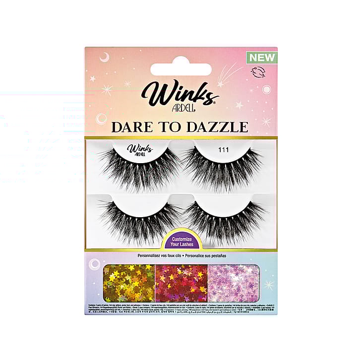 Winks x Ardell Lashes! Koristele ripsesi, silmäsi ja kasvosi Ardells Dare go Dazzle -sarjalla. Lumoa ympäristö ja kirkasta jokaista ilmettä mukana olevilla koristeilla. Sarja sisältää kaiken, mitä tarvitset ripsiesi mallin räätälöimiseen ja unelmiesi toteuttamiseen: kaksi paria statement-ripsiä, sekoitus kiiltäviä koristeita, liimaa ja applikaattori. Winks-sarjan ripsissä on 30 % paksummat, tummemmat ripsikuidut, jotka antavat dramatiikkaa, tuuheutta ja pituutta rohkealle siluetille. Pyöristetty muoto silmän avaamiseen. Hiukan ristikkäiset, eripituiset ripset luovat tekstuuria. Pehmeät, kapenevat kuidut keventävät vaikutelmaa.