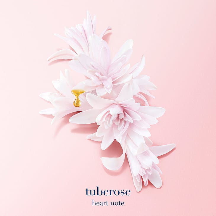 - Sydäntuoksussa on valkoinen kukkakimppu, josta paljastuu tuberosa-absoluutin täyteläisyys.