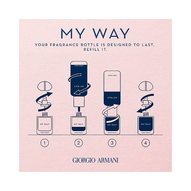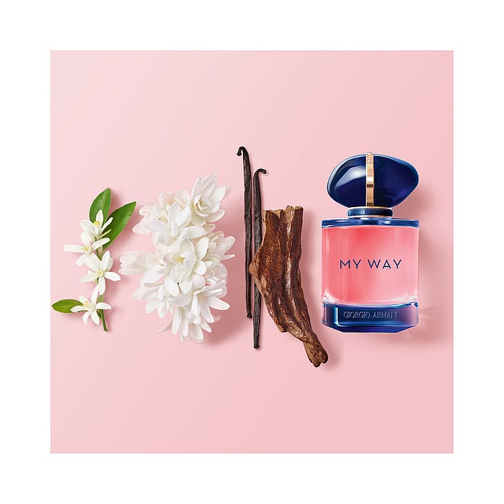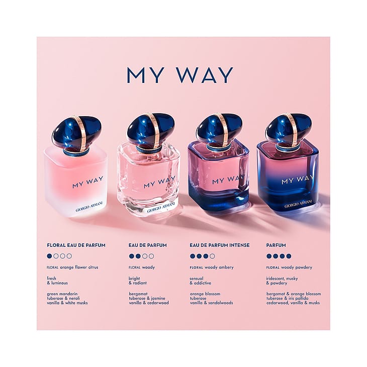 Giorgio Armani My Way intense on kutsu itsetutkisteluun, merkityksellisiin kohtaamisiin ja voimakkaisiin kokemuksiin. Intensiivinen kukkaistuoksu metsäisellä vivahteella on valmistettu vastuullisesti tuotetuista ainesosista. Tuoksussa avautuu Egyptin appelsiininkukkien raikas tuoksu. Intialaisen tuberosan intensiivinen sydäntuoksu paljastaa sametinpehmeän vivahteen kukkaistuoksusta. Uuden-Kaledonian santelipuu antaa pohjatuoksuun addiktoivan, täyteläisen vivahteen ja kohtaa metsäpolulla Madagaskarin täyteläisen vaniljan. Sinikultainen, jalokivimäinen korkki symboloi talismaania, joka vangitsee kaikki kokemukset. Korkkiin ikuistettujen hetkien intensiteetti näkyy My Way Intense -pullossa; sen lasi kylpee läpikuultavissa sinissä heijastuksissa. Ylellinen tuoksupullo on uudelleentäytettävä ja sisältää vastuullisesti ja kestävästi tuotettuja ainesosia. Talismaani, johon tiivistyy kaikki oleellinen: I AM WHAT I LIVE