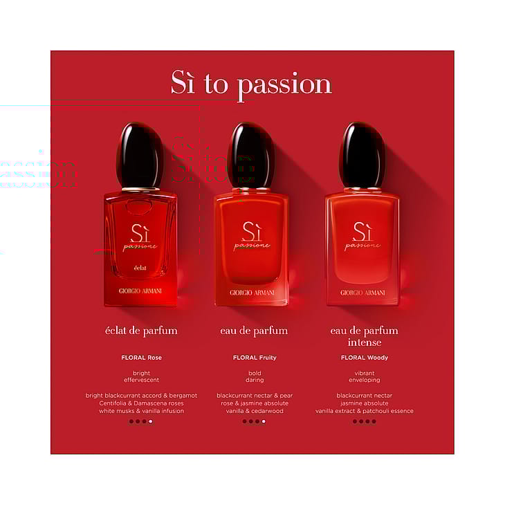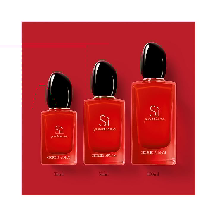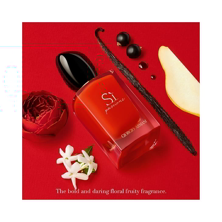 Giorgio Armani Sì Passione Eau de Parfum. Sì Passione on uusi ja vahva versio klassisesta Armani-tuoksusta ja se tuo uuden ulottuvuuden Giorgio Armanin naiselliseen tuoksuun – omien sanojensa mukaan se on “vastustamaton yhdistelmä tyylikkyyttä, voimakkuutta ja itsevarmuutta”. Sì Passione sisältää saman sydäntuoksun kuin klassinen Sì-tuoksu – Jungle Essence ™ koostuu mustaherukkauutteesta yhdistettynä pirskahtelevaan ja leikkisään päärynään. Sì Passione yhdistää intensiivisen vaniljan kukkaisiin ruusun, tuoksuheliotroopin ja jasmiinin vivahteisiin, jotka saavat aikaan aistikkaan, hedelmäisen kukkaisen tuoksun, joka säteilee sekä naisellista vahvuutta että haurautta. Sydäntuoksussa on setripuuta sekä moderneja Orcanox™-sävyjä meripihkan ja puun vivahteilla, jotka antavat tuoksulle Sì Passione -naiselle tyypillistä kypsyyttä ja luonnetta. Punainen väri on Sì Passion -tuoksun symboli ja asenne. Giorgio Armanin sanoin "Punainen kuvastaa elinvoimaa ja säteilee intohimoa. Punainen on menestyksen ja positiivisuuden symboli." Punainen on myös rakkauden väri ja se saa sydämen lyömään nopeammin. Uudenlainen tunne, naisellisuus ja persoonallisuus. Uusi intohimo. Hemmottele rakastasi ylellisellä Armanin lahjalla. Tämä tuoksu on täydellinen lahja naiselle.