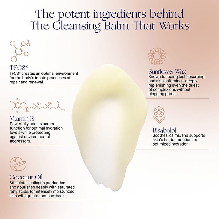 The Cleansing Balm on ihoon sulava, hellävarainen puhdistusbalmi, joka liuottaa meikin ja lian, samalla ihoa raviten. Se hyödyntää patentoitua TFC8®-teknologiaa, joka sisältää yhdisteen ihon luonnollisia ainesosia (mm. aminohapot ja vitamiinit), 30 vuotiseen tutkimustyöhön perustuen. Balmi syväkosteuttaa ja jättää ihon puhtaaksi sekä tasaiseksi, pH:ta tasapainottaen. Mukana tulee puhdistuspyyhe, jonka avulla saavutat parhaan mahdollisen lopputuloksen. Puhdistusbalmi ja puhdistuspyyhe Syväkosteuttaa ja ravitsee Poistaa tehokkaasti meikin
