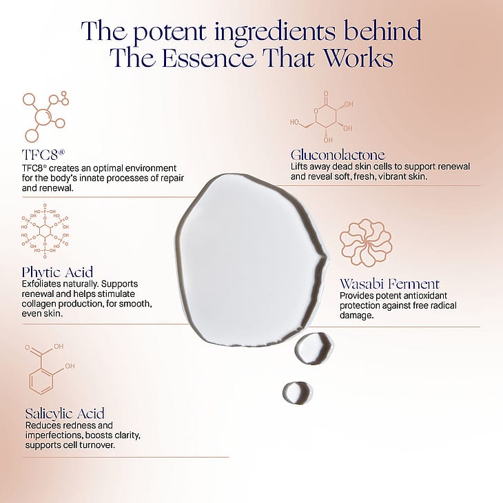 The Essence on monipuolinen, nopeasti imeytyvä 3-in-1 hoitoneste: se kuorii ihoa kevyesti, syväpuhdistaa ja kosteuttaa. Koostumus auttaa vähentämään näkyviä ihohuokosia, säätelemään talineritystä, rauhoittamaan punoitusta ja tasoittamaan ihon sävyä. Hoitoneste sisältää Augustinus Baderin patentoidun TFC8®-yhdisteen, joka vahvistaa ihon omaa korjaantumisprosessia. Kasviuutteet ravitsevat ihoa ja suojaavat sitä ympäristön haittavaikutuksilta. Monikäyttöinen 3-in-1 hoitoneste Kuorii, syväpuhdistaa ja kosteuttaa Patentoitu yhdiste vahvistaa ihon omaa korjaantumisprosessia