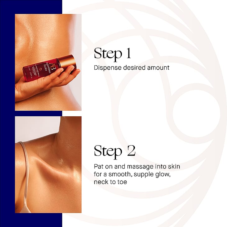 Taputtele ja hiero puhtaalle, kuivalle iholle halutessasi tasaisen, kimmoisan hehkun saamiseksi kaulasta varpaisiin.