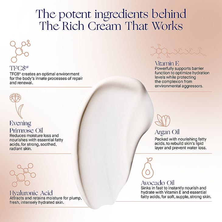 The Rich Cream on kasvojen ihoa virkistävä sekä syväkosteuttava kosteusvoide, joka tukee ihon omaa korjautumis- ja uudistumisprosessia patentoidun TFC8®-teknologian avulla: tehokas yhdistelmä ihossa luonnostaan esiintyviä aineita, kuten aminohappoja ja vitamiineja, 30 vuotiseen tutkimustyöhön perustuen. Voiteen on kliinisesti todistettu vähentävän näkyviä juonteita, ryppyjä sekä pigmenttimuutoksia. Se vahvistaa ihon omaa suojakerrosta, stimuloi kollageenituotantoa ja vähentää punoitusta. Syväkosteuttava kasvovoide Vahvistaa ihon omaa korjautumis- ja uudistumisprosessia Perustuu patentoituun teknologiaan