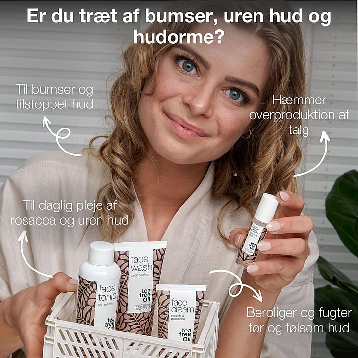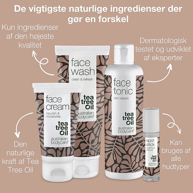 Kasvopakkaus, jossa on 4 tuotetta päivittäiseen ihon puhdistukseen ja hoitoon, sisältää kasvopuhdistusaineen, ihon tonikin, kasvovoiteen ja finnikynän, jotka antibakteeristen luonnonvarojen avulla torjuvat kasvojen puhdasta ja rasvaista ihoa.