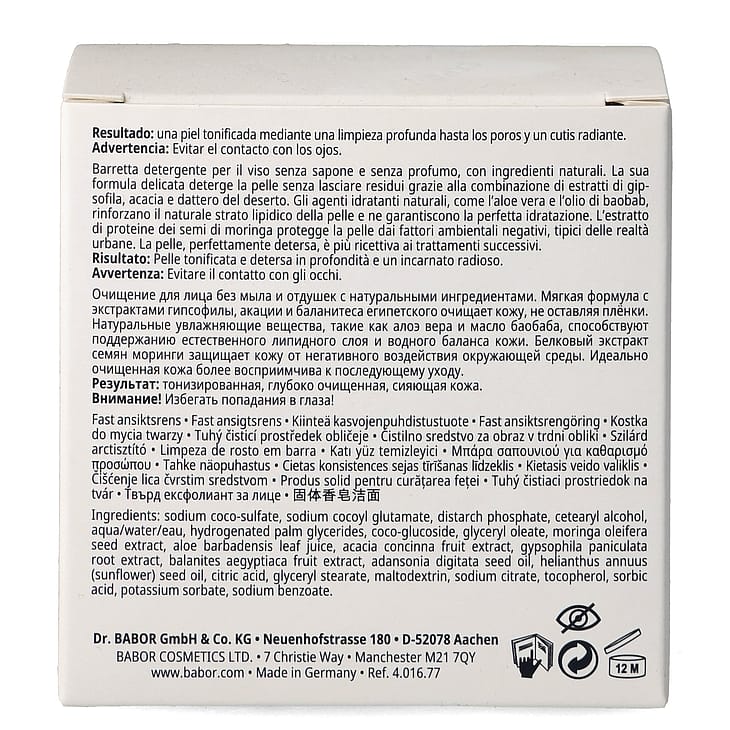 Mieto kasvojen puhdistusaine saippuan muodossa. Ei sisällä tuoksuja eikä saippuan kuivattavia ainesosia. Sisältää luonnollisia ainesosia, kuten egyptintokopuu- ja akasiauutetta sekä kosteuttavaa aloe veraa ja ravitsevaa baobab-siemenöljyä. Yhdessä ne ylläpitävät kosteutta ja pitävät ihoa suojaavan lipidikerroksen kunnossa. Samalla moringan siementen proteiiniuute suojaa ihoa ympäristön aiheuttamalta negatiiviselta stressiltä. Tuloksena on täydellisesti puhdistettu ja tasapainoinen iho.