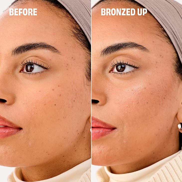 VINKKEJÄ: Muotoiluun levitä aurinkopuuteria poskipäiden alle, hiusrajaan ja leukalinjaan kasvojen muodon korostamiseksi. Haluatko hehkua, joka ulottuu kasvojen ulkopuolelle? Pyyhkäise kevyesti rinnan ja hartioiden yli saadaksesi tasaisen, auringon suuteleman lookin koko vartalolle.