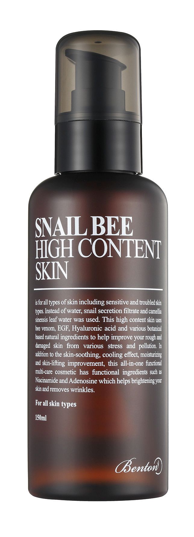 Snail Bee High Content Skin -kasvovesi auttaa ihoa sitomaan kosteutta ja vahvistamaan ihon omaa toimintaa suojaten sitä päivittäiseltä stressiltä ja ympäristöhaitoilta. Snail Bee High Content Skin on täysin vedetön ja pohjautuu etanan eritteestä valmistettuun filtraattiin sekä vihreään teehen. Kasvoveden pääainesosat ovat: