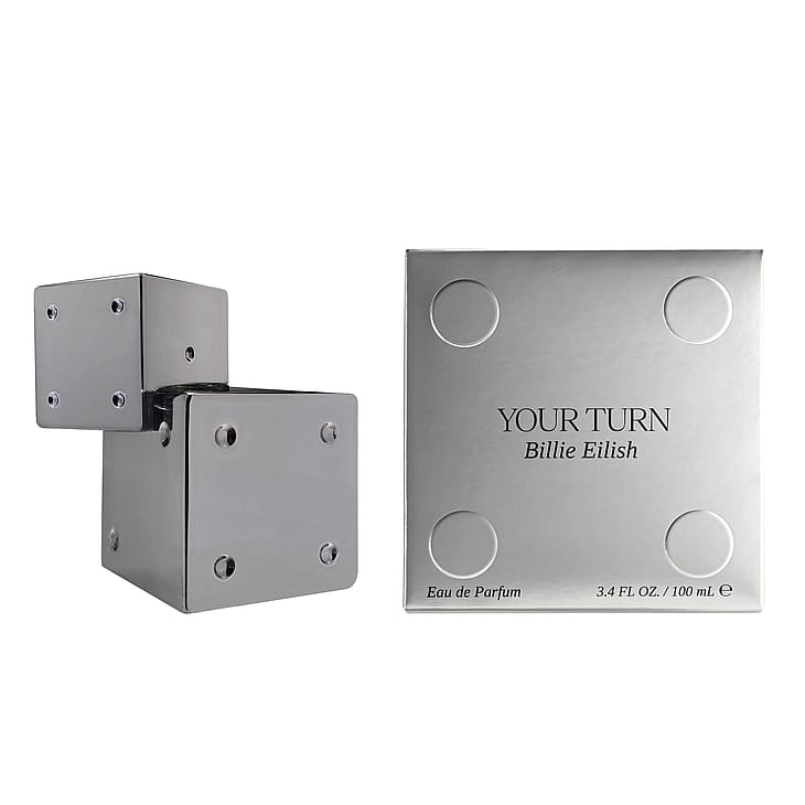 Your Turn -tuoksun pullo on saanut inspiraationsa Billien kiinnostuksesta sisustukseen ja itseilmaisuun. Design esittää kahta päällekkäistä noppaa, joissa on kohokuvioidut pisteet. Pullon tyylipuhtaat ja minimalistiset linjat sekä hopeakromiviimeistely tekevät siitä nykyaikaisen taideteoksen, joka antaa sekä leikkisän että jännittävän vaikutelman ja heijastaa tuoksun rohkean vangitsevaa luonnetta.