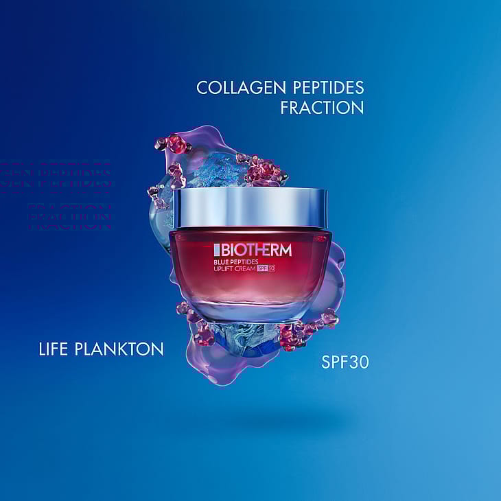 Biotherm Blue Peptides Uplift Cream SPF 30: Blue Peptides Uplift Cream SPF 30 on Biothermin uuden Blue Peptides -ihonhoitosarjan jäsen, joka antaa kiinteämmän ihon ja hehkun. Blue Peptides Uplift Cream SPF 30 on kosteuttava ja kiinteyttävä päivävoide kaikille ihotyypeille, myös herkälle iholle. Koostumus sisältää uraauurtavia biotieteellisiä innovaatioita ja kollageenipeptidifraktioita sekä Biothermin avainainesosaa Life Planktonia™ ja ne kompensoivat ihon kollageenin menetyksestä johtuvia näkyviä ikääntymisen merkkejä ja auttavat säilyttämään ihon kiinteänä. Koostumus sisältää myös tehokkaan suojakertoimen, joka suojaa ihoa auringon UV-säteitä vastaan ja niiden aiheuttamilta ikääntymisen merkeiltä.