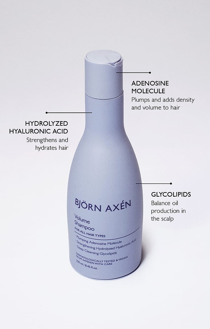 Levitä kosteisiin hiuksiin ja hiuspohjaan. Vaahdota hierovin liikkein ja huuhtele huolellisesti. Pese hiukset shampoolla toisen tai useammankin kerran saadaksesi hiuksille syväpuhdistuksen ja runsaamman vaahdonmuodostuksen. Huuhtele huolellisesti. Käytä yhdessä Björn Axén Volume Conditionerin kanssa tehostaaksesi tuuheuttavaa vaikutusta.