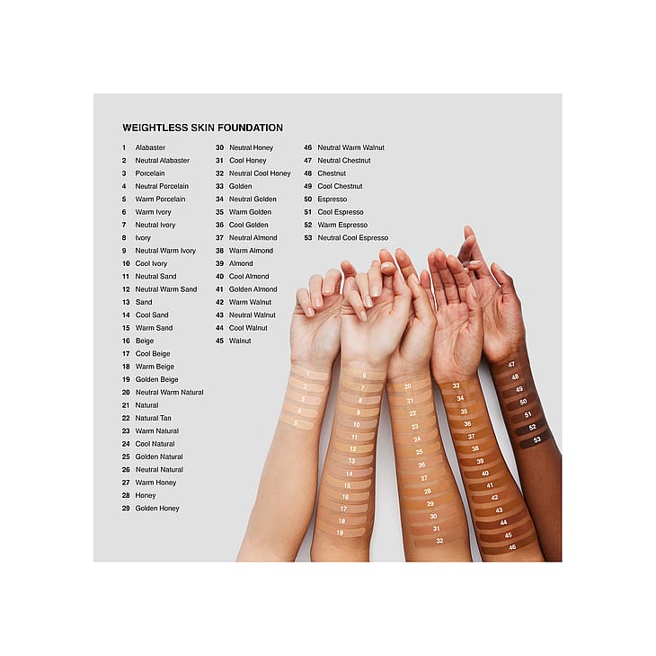 Weightless Skin Foundation SPF15 on meikkivoide, joka tuntuu ihanan kevyeltä iholla samalla kun se tarjoaa jopa 24 tunnin keston ja kosteutuksen. Tämä meikkivoide jättää iholle luonnollisen mattapintaisen ja medium-peittävän lopputuloksen.