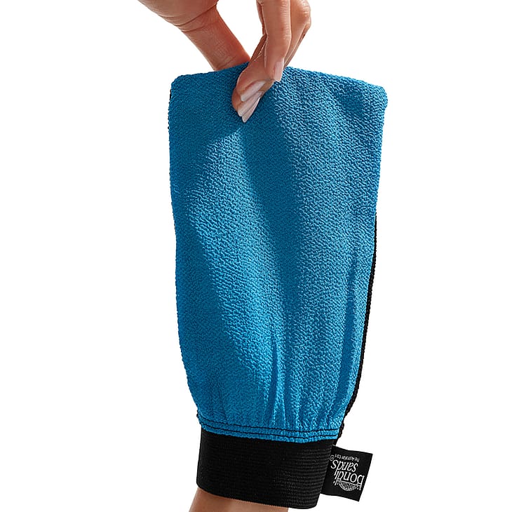 Bondi Sands Exfoliating Mitt on uudelleenkäytettävä kuorintakinnas, jolla voit valmistella ihon tasaista ja virheetöntä itserusketusta varten. Musta puoli kuorii ihoa, poistaa kuolleet ihosolut ja irrottaa aiemmin käytetyn itseruskettavan tuotteen jäänteet. Sininen puoli auttaa poistamaan ei-toivotut tulokset, kuten raidat.