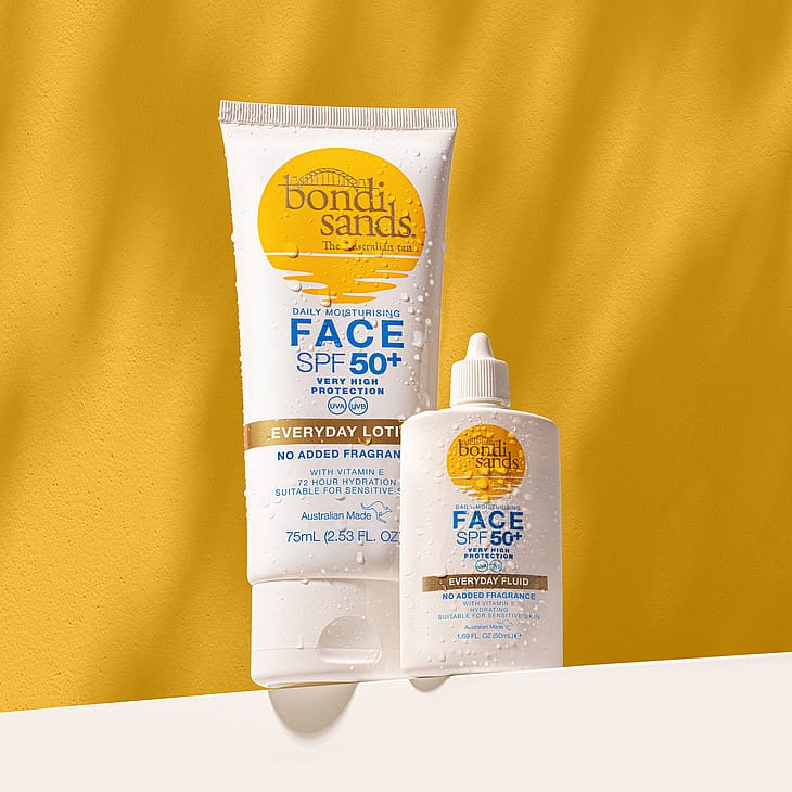 Nauti auringonpaisteisesta päivästä Bondi Sandsin tyyliin Fragrance Free SPF 50+ Face Fluid -kasvonesteemme avulla. UVA- ja UVB-suojaa tarjoava, erittäin kevyt kasvoneste on hellävarainen, nopeasti imeytyvä ja kuivuu näkymättömäksi. Voidaan käyttää yksinään tai meikin alla. Dermatologisesti testattu. Sopii herkälle iholle. Ei komedogeeninen - ei tuki huokosia.