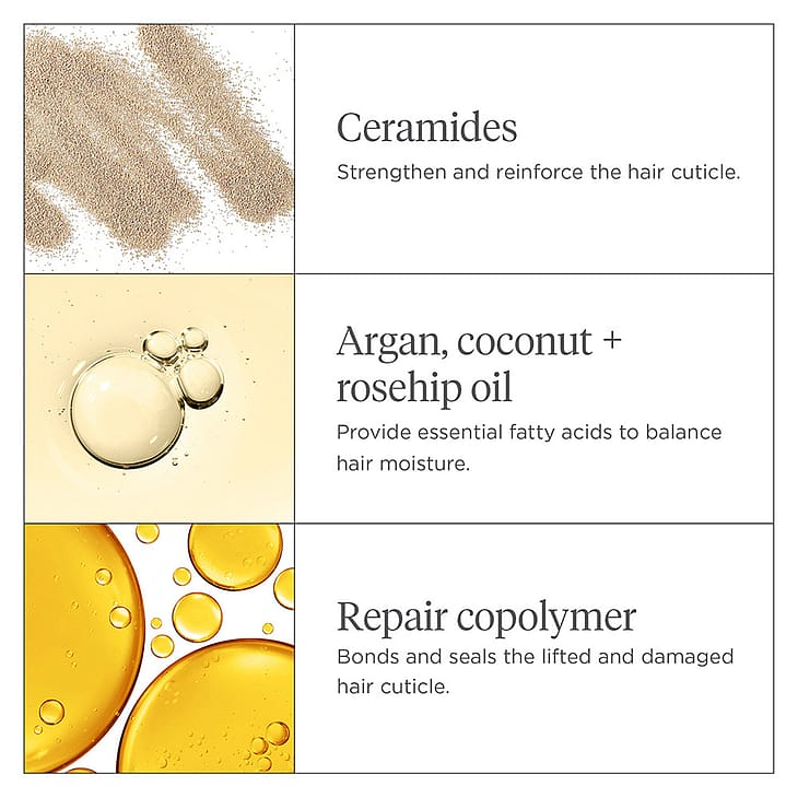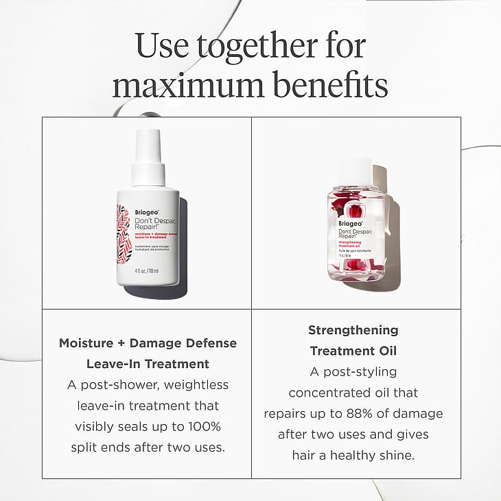 Don't Despair Repair™ Moisture + Damage Defense Leave-in Treatment on näkymätön, vahvistava ja kosteuttava hiuksiin jätettävä naamio, joka toimii koko päivän ajan parantaen hiusten rakennetta, pehmeyttä ja kiiltoa kuitenkaan latistamatta niitä. Koostumus on rikastettu keramideilla, välttämättömiä rasvahappoja sisältävillä öljyjillä sekä B-vitamiinilla, jotka palauttavat kosteuden vaurioituneisiin hiuksiin ja auttavat korjaamaan vaurioita. Tieteellisesti todistettu Repair Technology Complex -yhdiste sulkee näkyvästi jopa 100 % kaksihaaraisista kahden käyttökerran jälkeen ja varjelee hiuksia katkeilulta jatkossa.