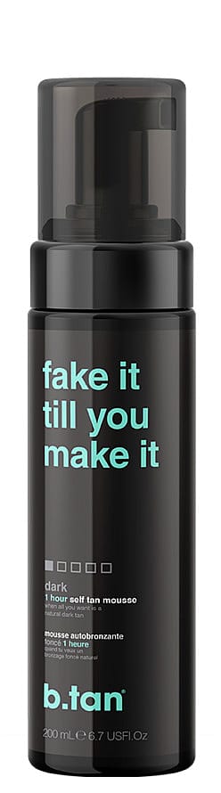 Fake It Till You Make It Self Tan Mousse on itseruskettava mousse. Se luo iholle kauniin ja luonnollisen tumman rusketuksen vain 1 tunnissa ilman tyypillistä itseruskettavan tuoksua. Näkyviä tuloksia 1 tunnissa. Anna vaikuttaa enintään 8 tuntia, jos haluat tummemman lopputuloksen. Mousse on 100% vegaaninen.