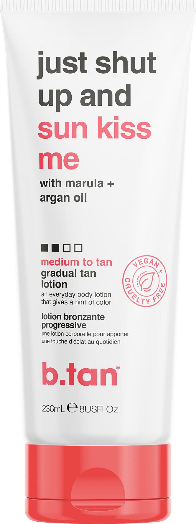 Just Shut Up & Sunkiss Me Gradual Tan Lotion on päivittäiseen käyttöön tarkoitettu itseruskettava voide. Se luo asteittain keskitumman tai tumman, luonnollisesti hehkuvan rusketuksen. Kun päivittäinen kosteusvoide kohtaa kevyen itseruskettavan lotionin, iho saa ylimääräistä kosteutusta samalla kun se syvenee ja antaa pronssista hehkua. Sisältää kosteuttavaa marula- ja arganöljyä. Käytä päivittäin päivettyneen sävyn syventämiseen tai itseruskettavan tuotteen käytön jälkeen pidentämään rusketusta. Voide on 100% vegaaninen.