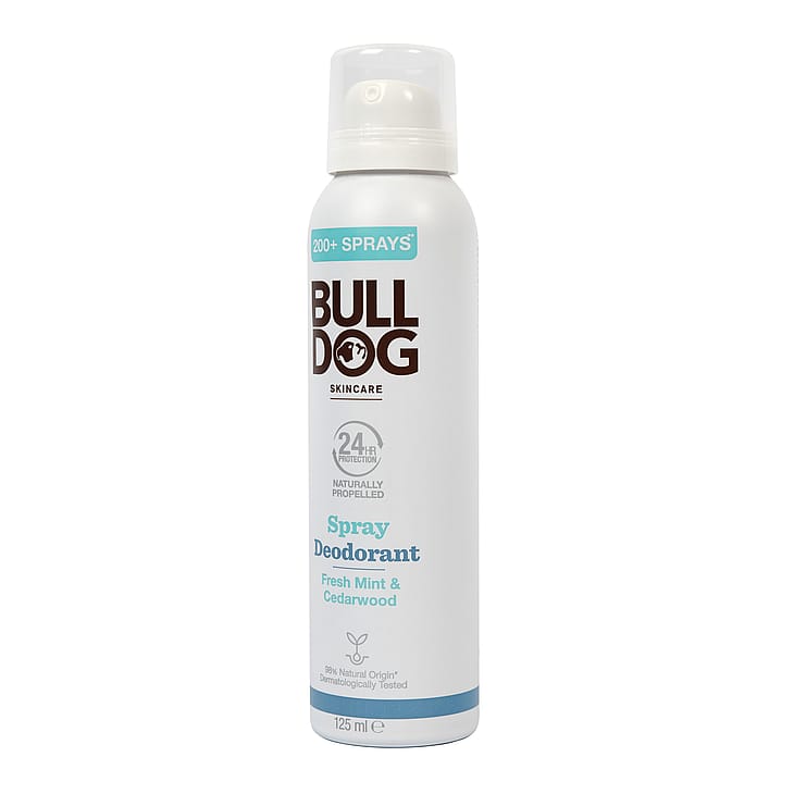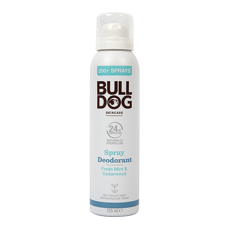 Bulldog Fresh Mint & Cedarwood Spray Deodorant on miesten spraydeodorantti, joka on suunniteltu antamaan 24 tunnin suojaa epämiellyttävää hajua vastaan. Deodorantti on raikastuoksuinen, ja sen tuoksu koostuu luonnollisista ainesosista. Tuoksussa on raikkaita sävyjä piparmintusta, bergamotista ja rosmariinista, joita täydentävät patsuli ja setripuu. Se yhdistää luonnon ja tieteen parhaat puolet ainutlaatuiseen tuoksuteknologiaan, joka tarjoaa suojan epämiellyttävää hajua vastaan ja pitkäkestoisen raikkauden. Sopii myös herkälle iholle.