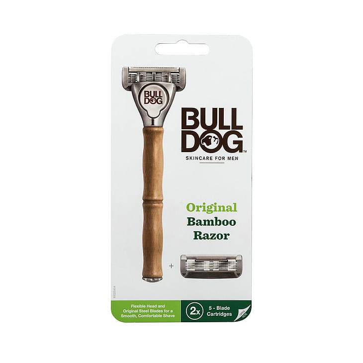 Pakkauksessa on Original Bamboo Razor ja kaksi viisiteräistä Bulldog Original Steel Blades -terää, jotta parta ajetaan tasaisesti ja mukavasti.