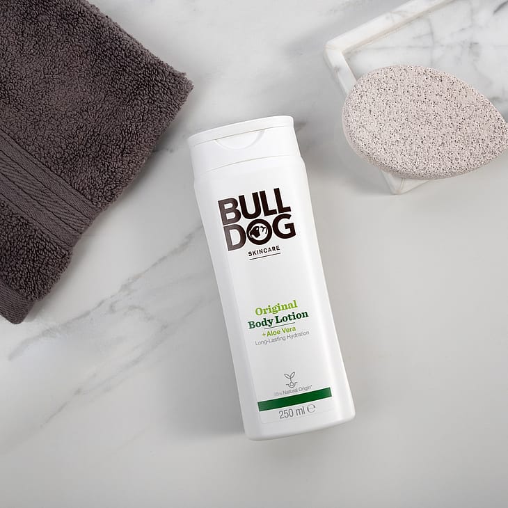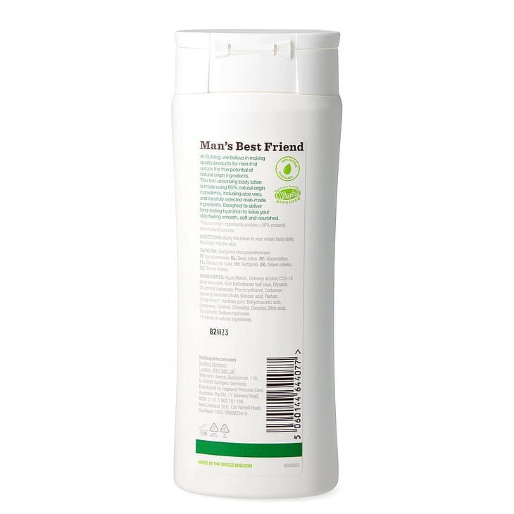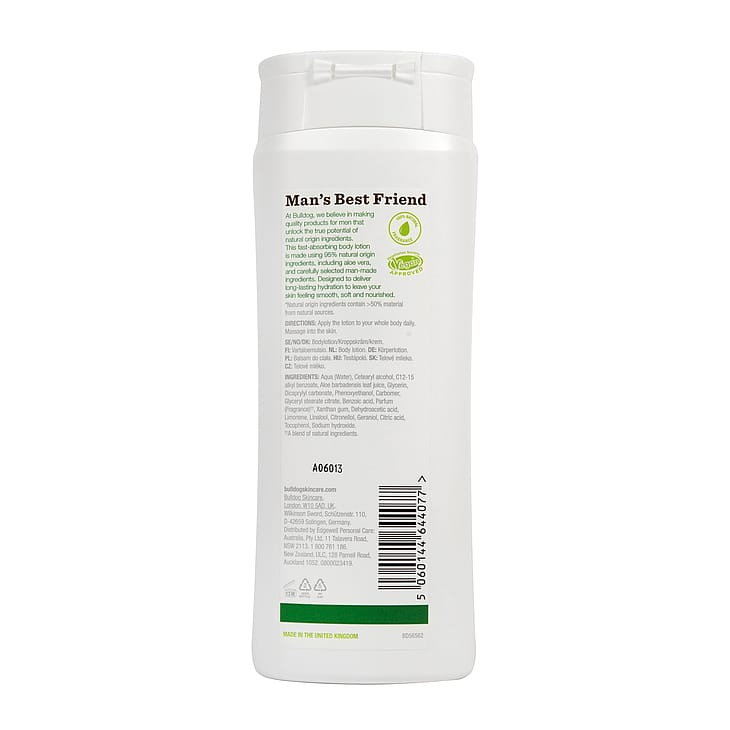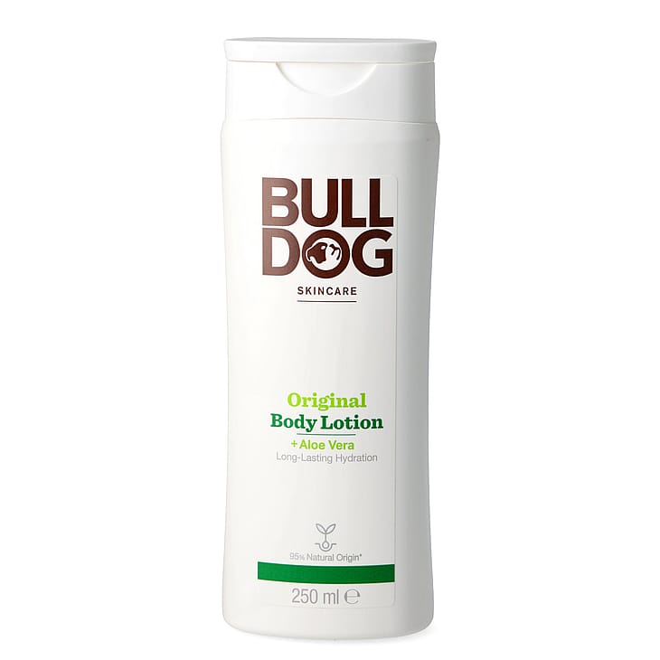 Bulldog Original Body Lotion on miehille tarkoitettu vartalovoide, jonka ainesosista 95 % on peräisin luonnosta. Kehitetty antamaan pitkäkestoinen kosteutus ja tekemään ihosta sileä, pehmeä ja ravittu. Tuote sisältää muun muassa aloe veraa, joka tunnetaan kosteuttavista ja rauhoittavista ominaisuuksistaan. Sopii normaalille ja kuivalle iholle. Imeytyy helposti ihoon tuntumatta rasvaiselta tai tahmealta, kosteuttaa koko päivän.