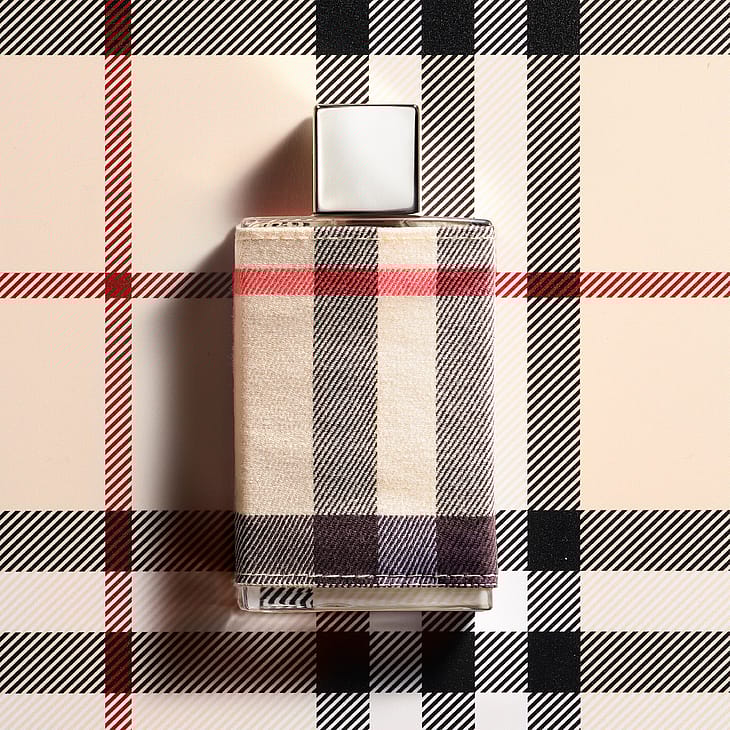 Pullo on kiedottu Burberryn klassiseen ruutukankaaseen, ikoniseen yksityiskohtaan, joka korostaa tuoksun ja muodin yhteyttä.