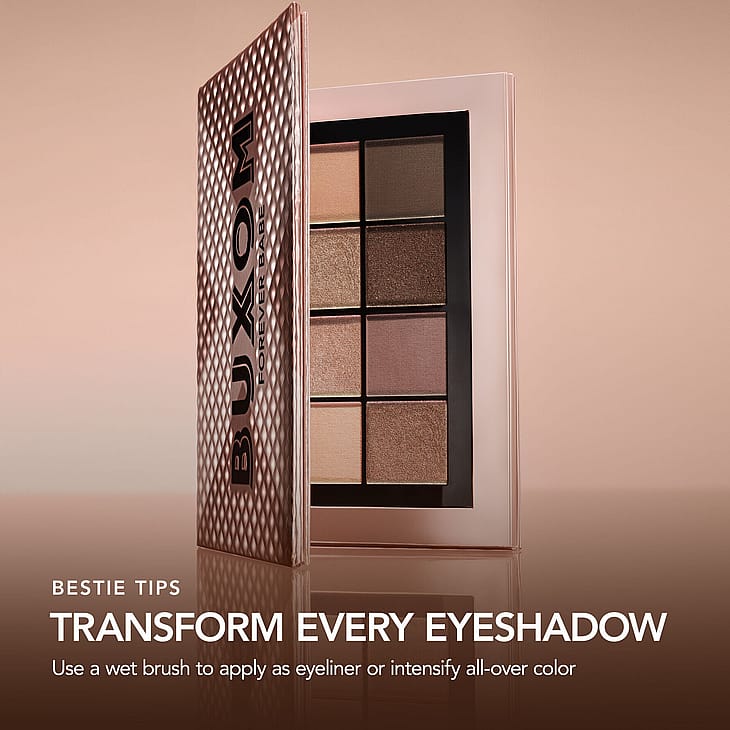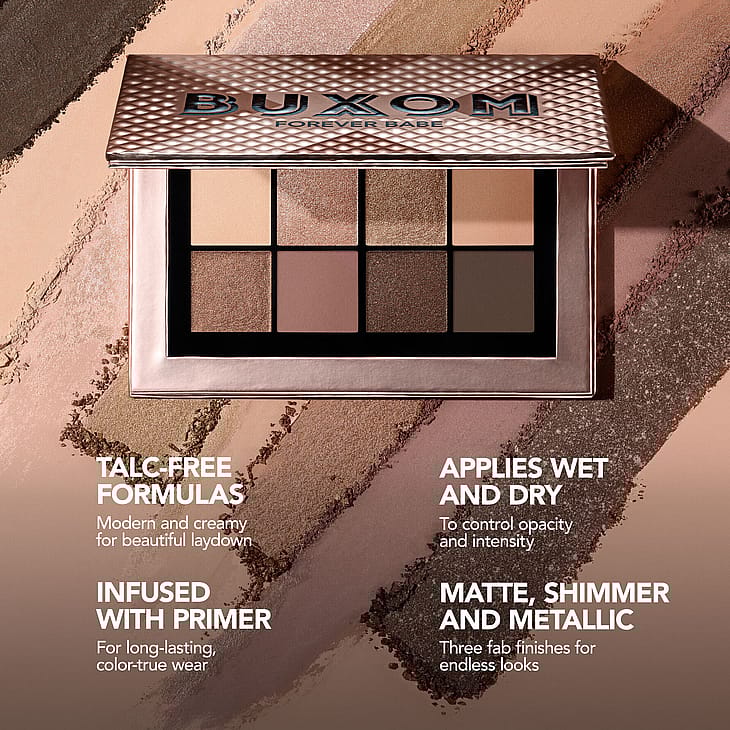 Kuratoitu paletti sisältää Buxom Cosmeticsin myydyimmät ikoniset suosikkisävyt uudessa talkittomassa, pohjustusvoidetta sisältävässä koostumuksessa.