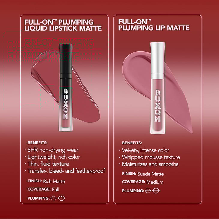 Buxomin ikoninen huulia täyteläistävä koostumus on nyt saatavilla täyspeittävässä nestemäisessä huulipunassa, joka tasoittaa huulten juonteita ja antaa 8 tuntia kestävän täyteläisen mattapintaisen värin. Ikoninen huulia täyteläistävä koostumus kasvattaa huulten kokoa, kun taas hyluaronihappo tasoittaa ja täyttää huulet, mikä tekee huulista täyteläisemmän.