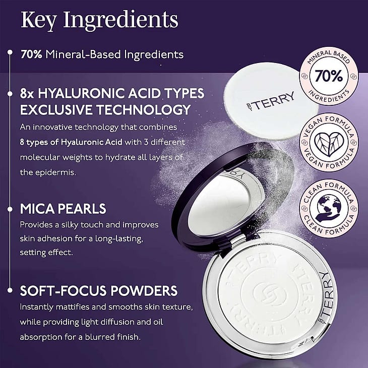 Läpikuultava meikinkiinnityspuuteri, joka ehkäisee kiiltoa ja luo täydellisen meikkipohjan kuivattamatta. Kosteuttava hyaluronihappoa sisältävä, silkkisen painoton koostumus. Sopii kaiken ikäisille, kaikille ihotyypeille ja ihon sävyille. Häivyttää laajentuneita ihohuokosia, juonteita ja muita ihovirheitä. Ehkäisee kiiltoa.