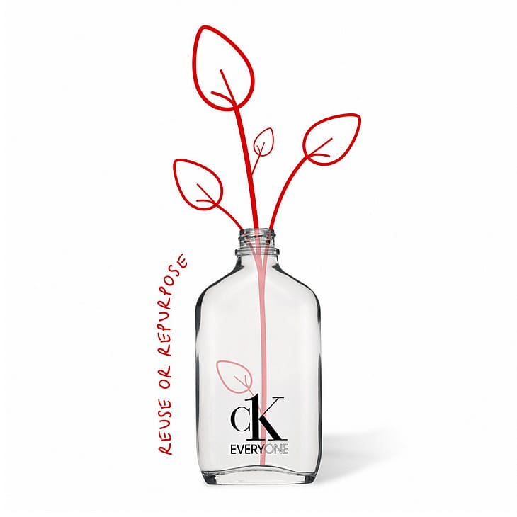 Kierrätettävän pyöreän lasipullon ympärillä on kunnianosoituksena Calvin Klein -alusvaatteille kuminauha, jota voit käyttää yhä uudelleen.