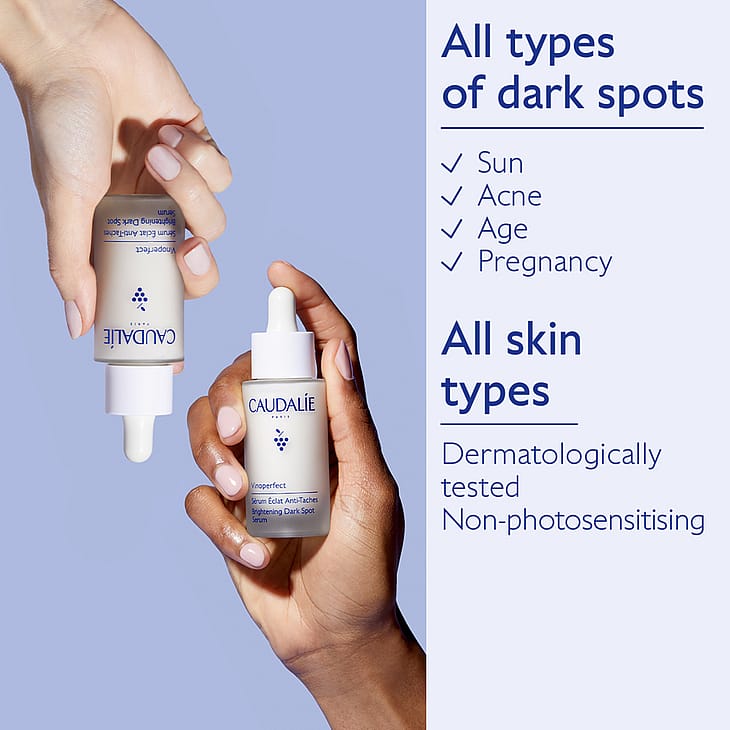 Vinoperfect Radiance Serum Complexion Correcting -seerumi häivyttää tummia läiskiä tehokkaasti ja vastustaa uusien muodostumista tehden ihosta tasaisemman ja hehkuvamman. Seerumi vaikuttaa kaikentyyppisiin läiskiin (auringon, aknen, melasman ja/tai iän aiheuttamiin). Muun muassa viniferine-ainesosan ja oliiviskvalaania sisältävä koostumus on hellävarainen ja sopii kaikille ihotyypeille, jopa erittäin herkälle iholle. 98 % ainesosista on luonnollista alkuperää. Testattu ihotautilääkärin valvonnassa. Ei tuki ihohuokosia.