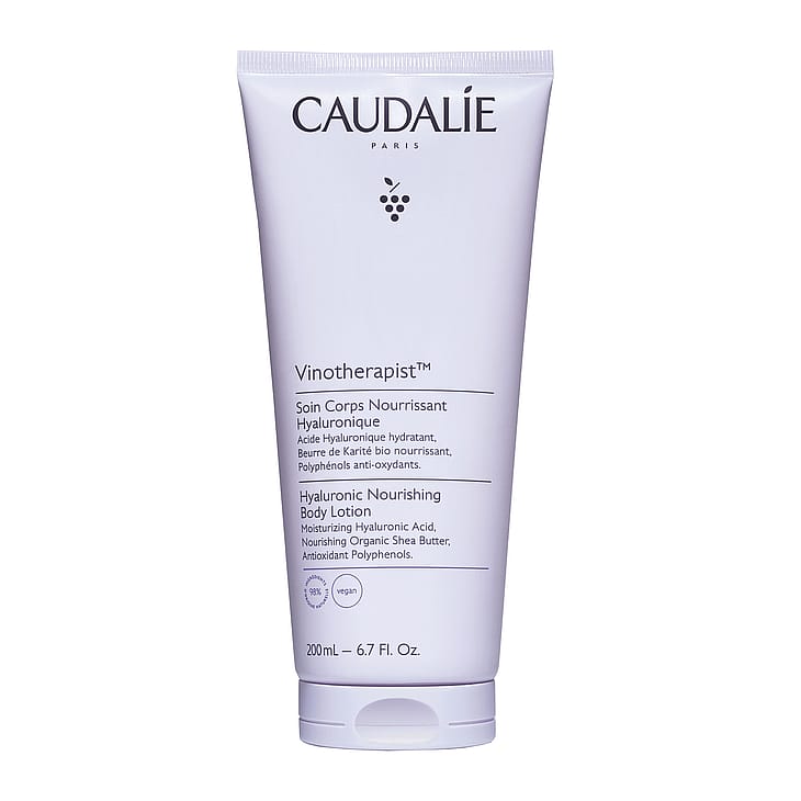 Caudalie Vinotherapist™ Hyaluronic Nourishing Body Lotion -vartaloemulsio sisältää hyaluronihappoa, ekologista karitevoita ja polyfenoleita. Se kosteuttaa ja ravitsee välittömästi tehden ihosta pehmeän, kimmoisan ja hehkuvan, kuin Vinothérapie™ Spa -kylpylähoidon jälkeen. Kevyt ja raikas koostumus imeytyy nopeasti ilman tahmaista tunnetta ja jättää iholle kevyen tuoksun. Vegaaninen koostumus. Testattu ihotautilääkärin valvonnassa. 98 % ainesosista on luonnollista alkuperää.