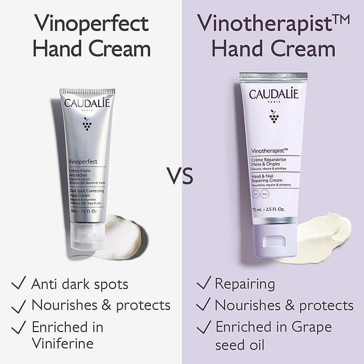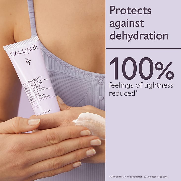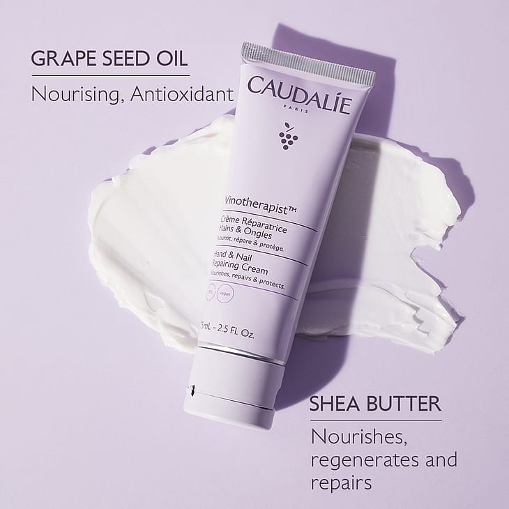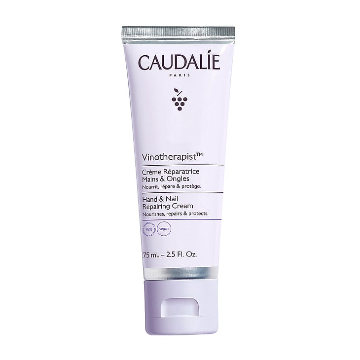 Caudalie Vinotherapist™ Hand & Nail Cream sisältää rypäleensiemenöljyä, ekologista karitevoita ja polyfenoleita, jotka ravitsevat ja korjaavat kuivia käsiä ilman tahmaista tunnetta. Suojaa ihoa kuivumiselta ja ulkoisilta rasitustekijöiltä. Avokado- ja oliiviöljy ravitsevat tehokkaasti ja antavat miellyttävän tunteen. Pehmentää ihoa, vastustaa kireää tunnetta sekä vahvistaa kynsiä ja kynsinauhoja. Vegaaninen koostumus. 98 % ainesosista on luonnollista alkuperää.