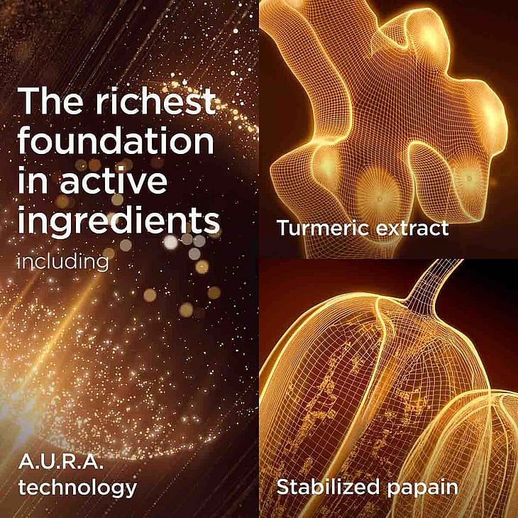 [COLOUR]-vaiheessa uusi A.U.R.A. (Advanced Ultra Radiance Amplifier) -teknologia, jossa on valoa vahvistavia ainesosia ja valoa heijastavia mikrokiteitä, antaa välittömän hehkun.