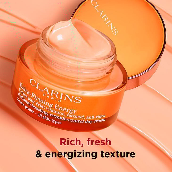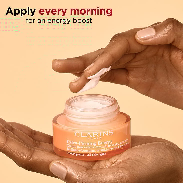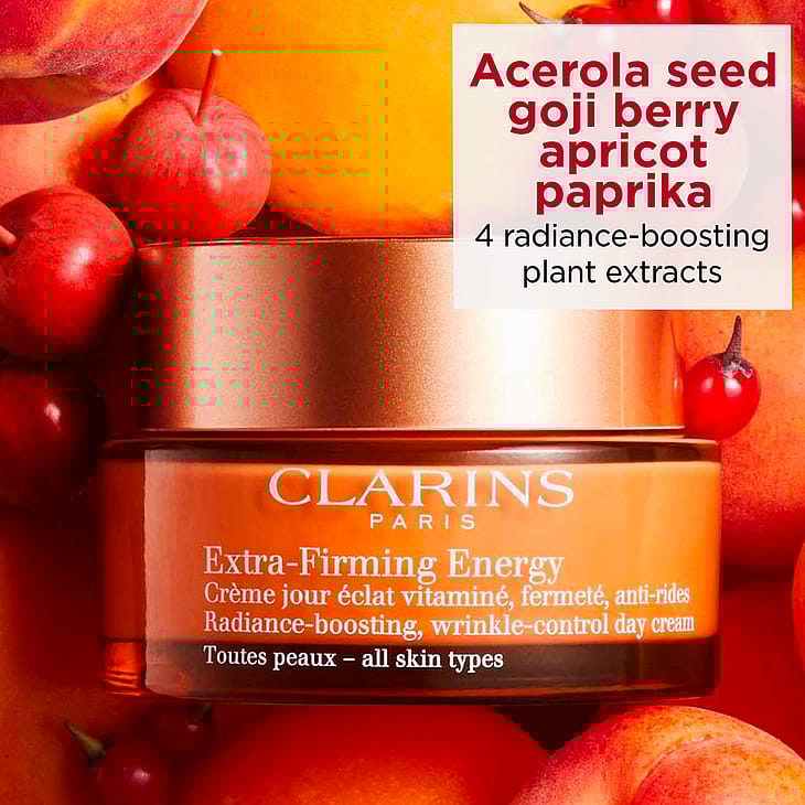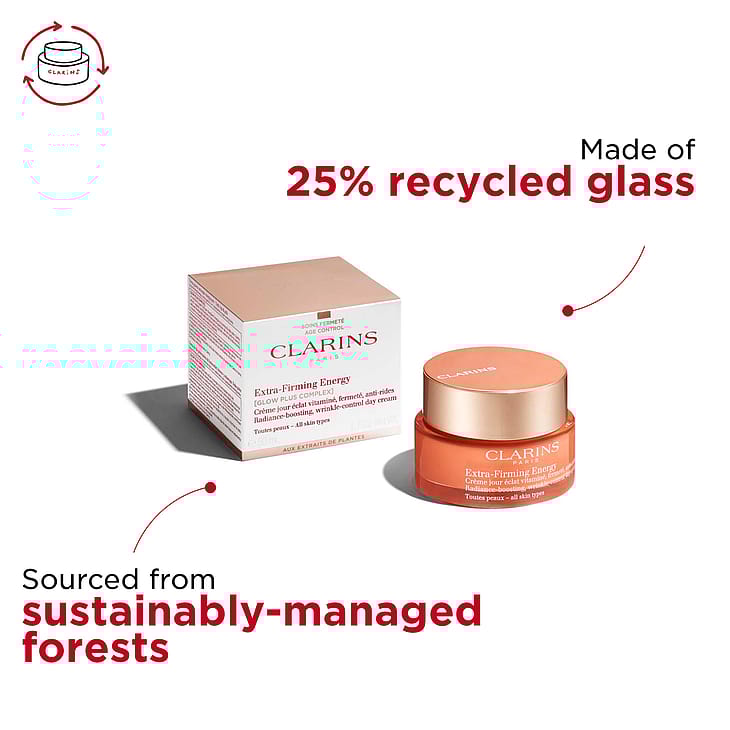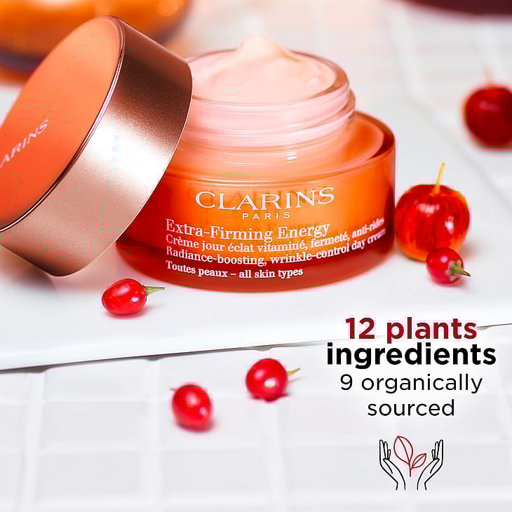 Kiinteyttävä 2-in-1-päivävoide, jossa on anti-age-vaikutus, energisoivia supervoimia ja silottava koostumus, joka auttaa ihoa saamaan takaisin nuorekkaan hehkunsa. Sopii naisille, jotka ovat huolissaan elottomasta ihosta ja ryppyjen syntymisestä. Aprikoosinsävyinen kevyt ja silkkinen koostumus antaa iholle välittömästi tervettä hehkua. Ihosta tulee päivä päivältä kiinteämpi ja elinvoimaisempi ja juonteet vähenevät. Tuoksu on hedelmäisen kukkainen ja energisoiva. Koko Extra-Firming-sarja sisältää runsaasti tehokkaita anti-ageing-ainesosia, jotka auttavat säilyttämään ihon kiinteyden, joustavuuden ja hehkun noin 40-vuotiailla naisilla. Luomukengurunkukka tekee ihosta kimmoisamman ja täyteläisemmän ja ehkäisee ihon veltostumista. Sillä on myös ihoa uudistavia ominaisuuksia. Erityinen Glow Plus -koostumus sisältää neljää hedelmää, joiden supervoimat auttavat hapettamaan, energisoimaan, pehmentämään ja ravitsemaan ihoa sekä antamaan sille tervettä hehkua. Luomumitracarpus-uute ja luomukaurauute silottavat ja täyteläistävät ihoa. Luomuegyptintokopuu ehkäisee pigmenttiläiskiä ja luonnonmukainen Leaf of Life -uute kosteuttaa ihoa. Clarinsin anti-pollution-yhdiste suojaa ihoa ilmansaasteilta. ● Heleyttää ja antaa energiaa ● Kiinteyttää ja tekee kimmoisammaksi ● Täyteläistää ja silottaa ● Miellyttävä ja kosteuttava