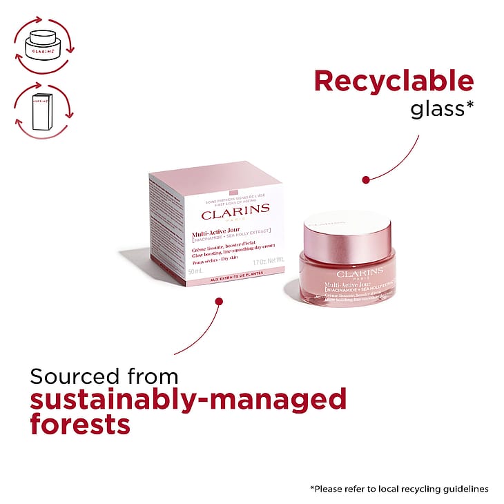 Kun iho altistuu intensiiviselle arjelle ja elämäntyylille, on sen säilytettävä energiansa ja puolustuskykynsä – Clarins Multi-Active Day Dry Skin voi auttaa siinä ainutlaatuisella ainesosayhdistelmällään: Skin Charger Complex sisältää niasiiniamidia ja piikkiputkiuutetta – tehokas kaksikko, joka auttaa häivyttämään ensimmäisiä ikääntymisen merkkejä. Tisteliuutteella on elinvoimaa antavia ominaisuuksia, jotka antavat iholle uutta energiaa. Aprikoosiöljy auttaa antamaan kuivalle iholle miellyttävän tunteen. Mansikkapuu-uute auttaa kohentamaan ihon tekstuuria ja häivyttää ihohuokosia. Lisäksi koostumus sisältää Clarins Anti-Pollution Complex -yhdistelmän.
