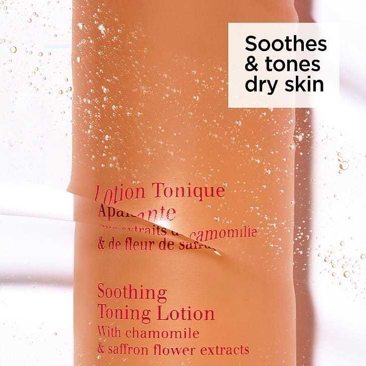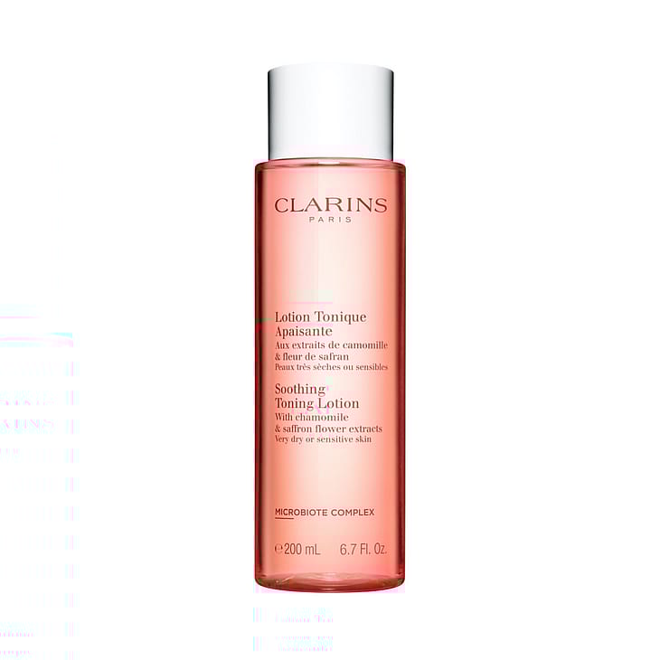 Soothing Toning Lotion -kasvovesi on erityisesti kehitetty erittäin kuivalle ja herkälle iholle. Se poistaa meikin, rauhoittaa ihoa sekä auttaa säilyttämään sen tasapainon. Koostumus sisältää kamomillauutetta, joka rauhoittaa ja pehmentää kuivaa ihoa. Koostumuksen Clarins Microbiota Complex -yhdistelmä sisältää sahraminkukan polyfenoleita ja meripohjaista prebiomia, jotka auttavat säilyttämään ihon mikrobiomin tasapainon. Uusi design ja entistäkin ympäristöystävällisempi pullo.