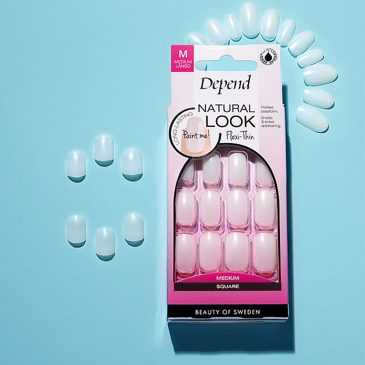 Värjäämättömät tekokynnet, jotka voit lakata oman tyylisi mukaisiksi. Täydellisesti istuvat Flexi-Thin-kynnet on helppo kiinnittää mukana tulevalla liimalla.