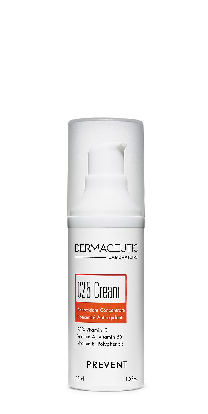 Suojaava tiiviste, joka ehkäisee pigmenttimuutoksia ja ryppyjä. Korkea stabiloidun C-vitamiinin pitoisuus tekee ihosta uskomattoman hehkuvan. C25 Cream sisältää uraauurtavan antioksidantteja sisältävän koostumuksen, jonka avulla voidaan ehkäistä tehokkaasti vapaita radikaaleja ja suojata ihoa auringonsäteilyltä ja ilmansaasteilta. Näin ryppyjä ja värivirheitä aiheuttavia tekijöitä pystytään rajoittamaan. Askorbosilaani C (vakaa C-vitamiinijohdannainen) suojaa kollageenikuituja ja yll äpitää ihon kosteustasoa.