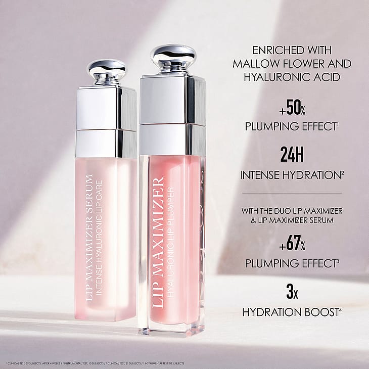 Käytettynä täytelöittävän Dior Addict Lip Maximizer -huulikiillon alla kosteuttaa huulia välittömästi jopa 2,9 -kertaisesti.**