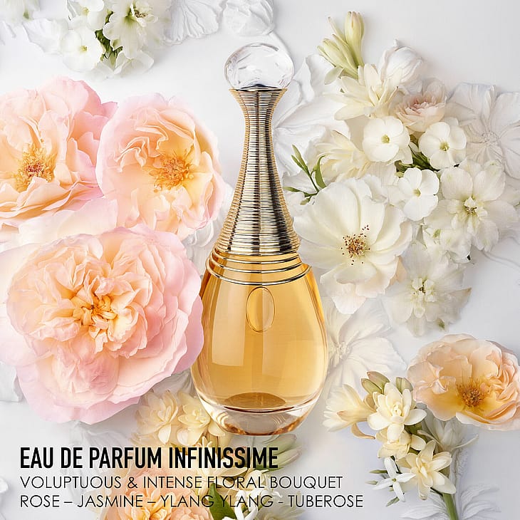 Aurinkoisen J'adore Eau de Parfum -sarjan aistillinen sisar on tuttu ja samalla yllättävä: J’adoresta tulee "infinissime," kuten sen ääretön tuoksujälki. "Grassen tuberosa tuo J’adore Eau de Parfum Infinissimelle ainutlaatuista, aistillista viehätystä. Lisäämällä sen J'adoren koostumukseen loin romanttisen kohtaamisen: ikään kuin J'adore viettelisi kiehtovan tuberosan syleilyynsä, keksimällä sen uudelleen ja antamalla sille valoa. Se luo välittömästi vaikutelman vahvasta ja itsevarmasta naisellisuudesta." Eau de Parfum Infinissimeä varten François Demachy päästi J'adore-kimpun kukat valloilleen, ja kietoi ne puisilla vivahteilla maustettuun kuumeiseen aistillisuuteen.
