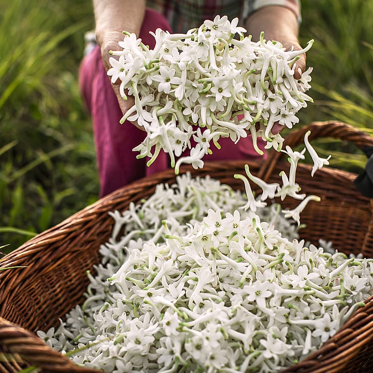 Se on kuin sylillinen kukkia, joka tulvii kartanonruusujen, jasmiinin, ylang-ylangin ja Grassen tuberosan vivahteita. Tuoksua täydentävät täyteläisen santelipuun vivahteet.