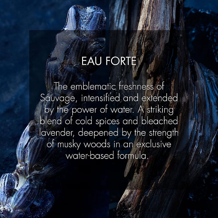 Sauvage Eau Forte on kuin vesiputous, joka antaa raikkautta ja intensiivisyyttä. Vesipitoinen koostumus sekoittuu tuoksuvaan öljyiseen koostumukseen ja muodostaa tämän erittäin tiivistetyn eau:n, jossa on maitomainen sävy.