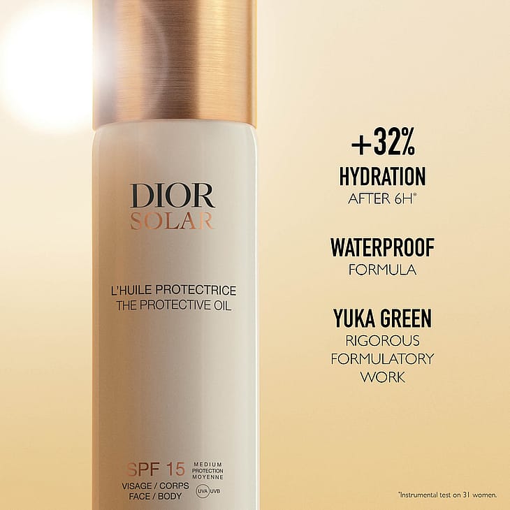 Dior Solar The Protective Face and Body Oil SPF 15 levitetään suihkeena, jolloin aurinkosuojaöljy levittyy optimaalisesti. Suojaa kasvosi suihkuttamalla öljyä ensin käsiisi ja sitten iholle.