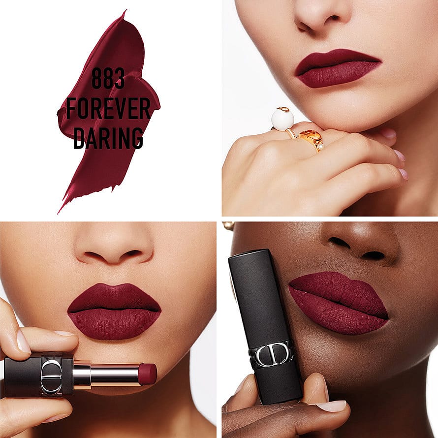 Tahraamaton Rouge Dior Forever -huulipuna ei sotke vaatteita ja sen ultramatta couture-väri säilyy huulilla pitkään. Sävyt ovat selkeitä ja rohkeita, voimakkaampia kuin koskaan ennen.
