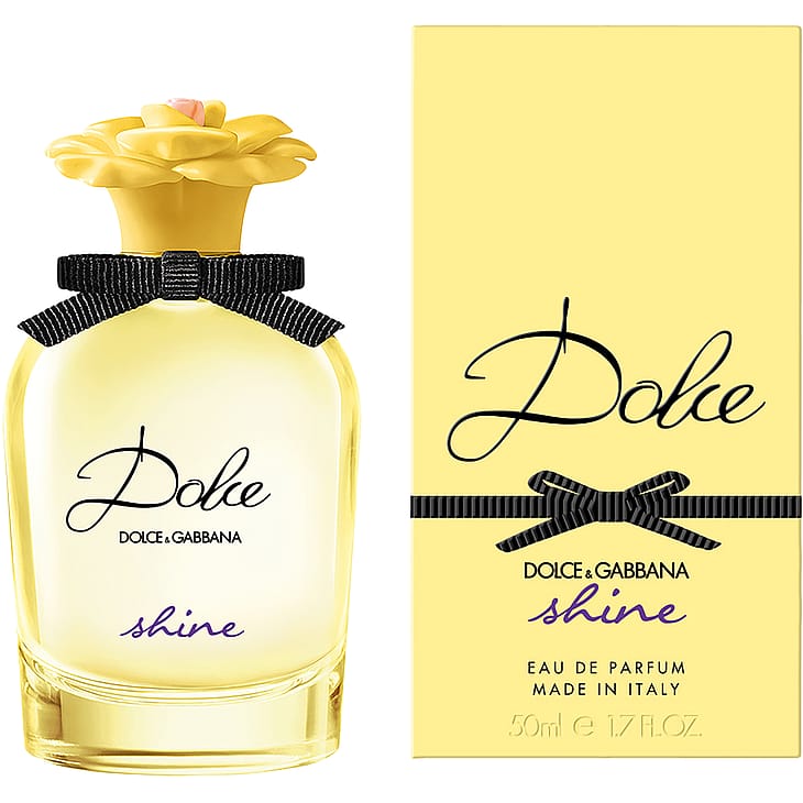 Dolce&Gabbana Dolce Shine Eau de Parfum -tuoksun pullolla ja ikonisesti muotoillulla, kaikista Dolce-tuoksuista tutulla korkilla, on pehmeä auringonkeltainen sävy. Lisäksi pulloa koristaa elegantti grosgrain-nauha.